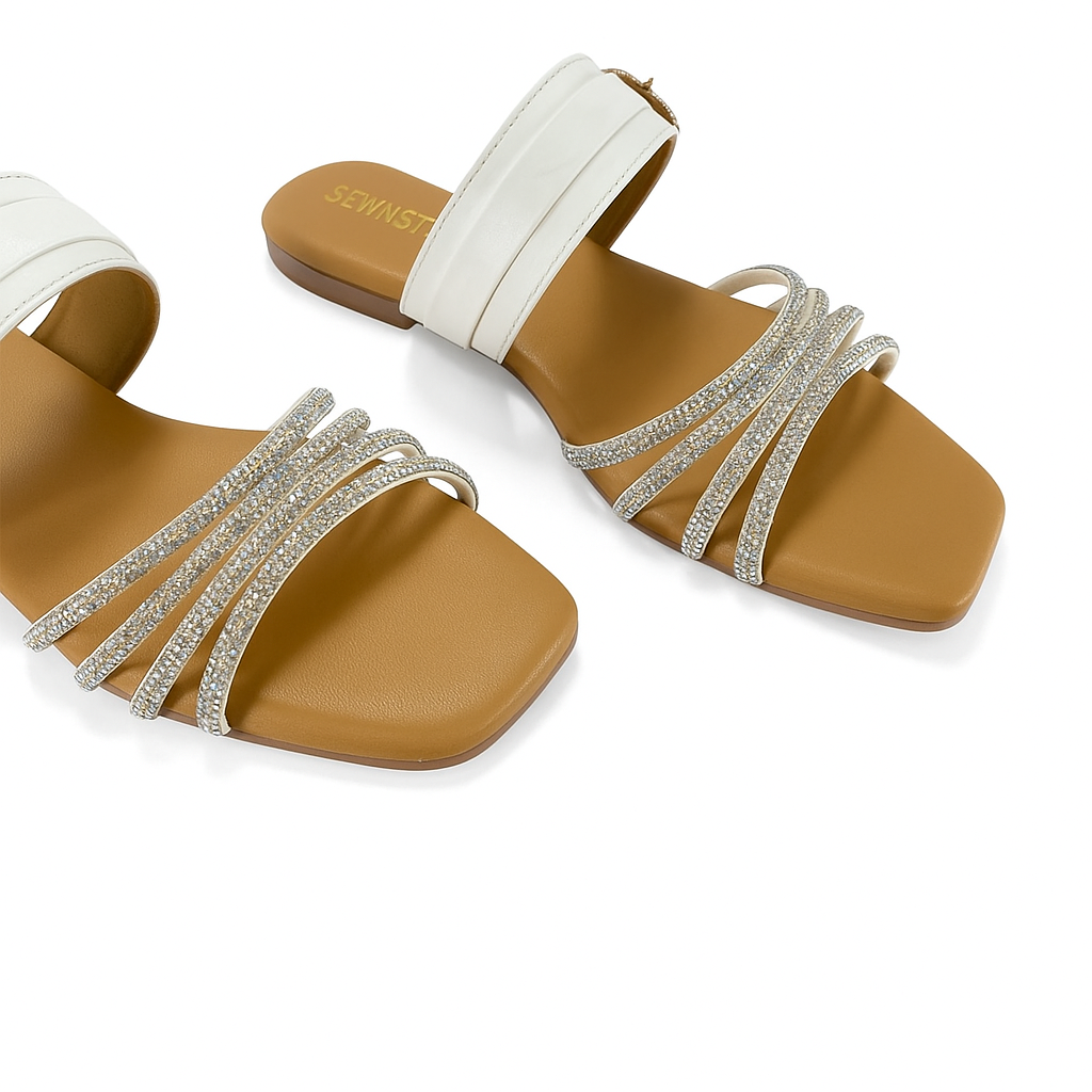 Add timeless elegance to your look with our Crystal Wave Flat. Designed with a chic white strap accented by a golden charm and shimmering multi-crystal straps, this flat blends sophistication with sparkle. Perfect for parties, weddings, or elevating everyday style, it offers both comfort and glamour in every step.