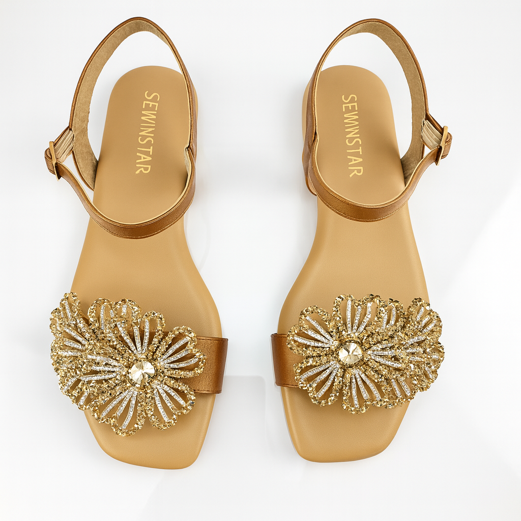 Elevate your style with the Flora Crystal Flats, crafted to bring luxury, comfort, and elegance together in one perfect pair. Designed with a beautifully detailed floral-crystal, these flats deliver a refined sparkle that stands out effortlessly in both Golden and Silver color options. The secure ankle-strap design gives a graceful, supportive fit, while the high-quality TPR sole ensures flexibility, durability, and all-day comfort. Made with premium materials and Sewnstar’s signature craftsmanship, these flats are perfect for festive wear, special occasions, or adding a touch of shine to your everyday outfits.